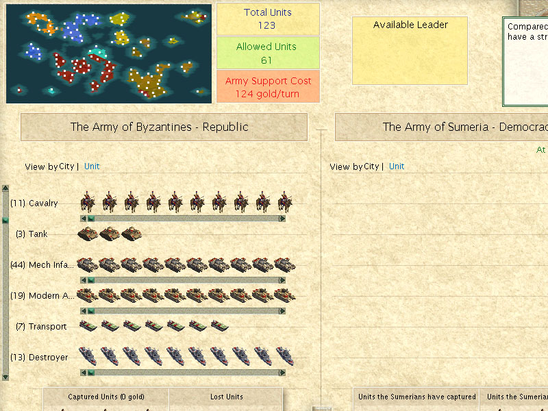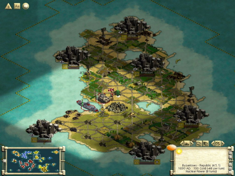 1630: Byzantine destroys the Hittites and is now the sole inhabitant of the former Sumeria/Hittite continent. Entire offensive conducted with 3 Tank Armies and 10 Artillery. The Dutch are still ahead in techs. I need to make peace with Maya and Russia (who declared with Hittites and have been trying to take Pi-Ramses, my former Egyptian city with Rubber. However, airport rushed and Tanks/TOW airlifted for defense along with workers to complete the Barricade on the choke point that holds the resource. Made peace with Maya for Fission and 90gpt.