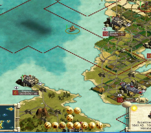 My “ferry” system of transports allows me to get newly built Armies from the M.Academy on the former Japanese island to the invasion staging point on the northern tip of the ex-Sumerian island, in 1 turn.