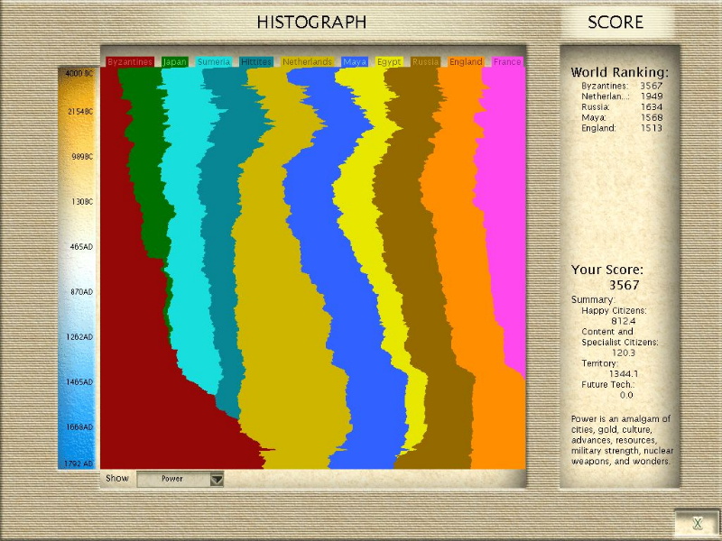 Screenie: The Byzantine build-up of power. Note the blip in the 1750's when Constantinople was nuked:So if you meet me have some courtesy, have some sympathy and some taste