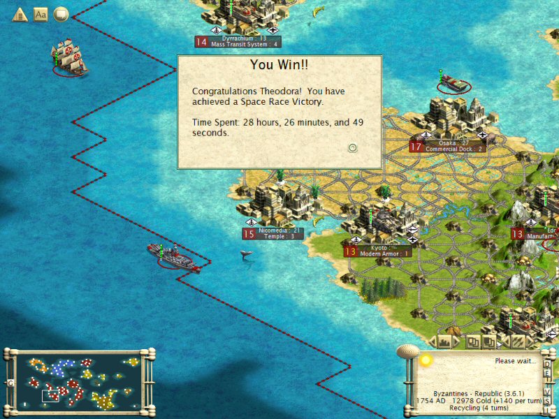 Okay so I haven't written much in this forum in the past few days, but I'm actually quite close to finishing the game via spaceship launch. I've secured at least one of every resource but rubber (and now no one can trade it to me), but at the close of last night Egypt declared war on me so I should be able to take their lone rubber source quite easily. Then I can build the one spacehip component that needs rubber.