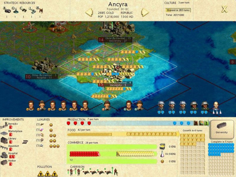 Unlike expansionist, which is also a map-dependent trait to a great degree, seafaring also gets (i) cheaper “sea-related” improvements, and (ii) a bonus gold in the city center when built on the coast. When faced with a water-laden map like ours, the seafaring trait is huge – and I think many underestimate the single bonus gold available on the coast. In games that remain tight in the middle ages or even the industrial ages, that extra gold, once operated upon by city improvements like markets, banks, libraries, or universities, can translate into two gold per city – across 15 cities, that can be significant (I could buy an extra source of rubber for 40 gpt in my game – the seafraing trait, at the time of RP, was worth almost as much as a source of rubber!