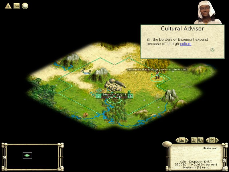 After the easy Monarch win, decided to I replay on Demi-god (a first-timer) and that was quite different. The other tribes showed up in great masses after just a few turns. Luckily, they left me alone and started beating on each other instead (passing through my land on their way). I was able to build 10 or so cities, build at least 20 Gallic swordsmen and introduce monarchy before Sumeria attacked. By then, the other tribes were far into the middle ages, while I was still researching literature or something. I could just forget building a wonder by myself.