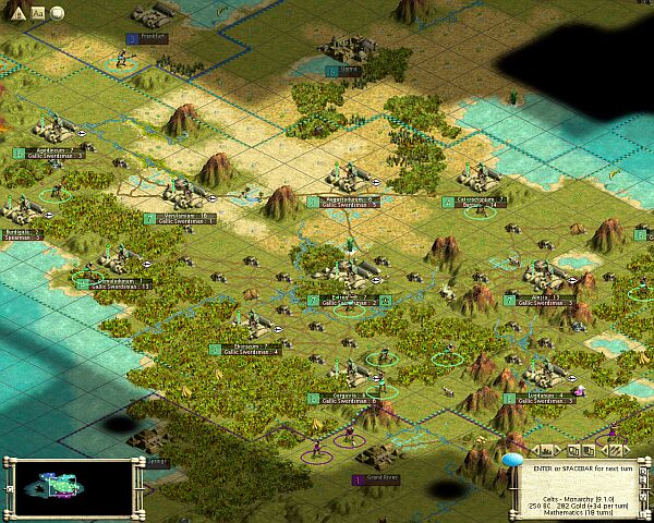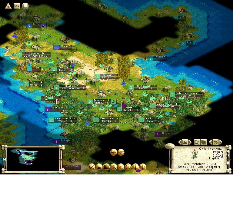 In 825bc Monarchy had been discovered and Brennus declared king. It was traded around for writing, maths, MM, lit, HBR and about 550 gold. Tech parity is a wonderful thing, but so is the AI on this game. One turn later a GS is rushed so that I can post this DAR and go to bed. S*d the cash.