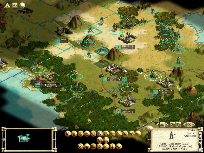 2070BC: Town of Benefit established. Keeping to a fairly tight 3-4 spacing, which may hurt me if I can’t get enough Settlers out before the AI encroaches too closely. The Sumerians are already threatening from the north. Brennus’ resolve on city spacing is wavering.