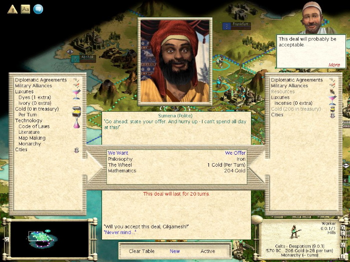 We are tempted to connect our second Iron and trade it to Gilgamesh for techs. But this will strengthen his military. Still, with the GS now available, we may do this as soon as our defences look reasonable