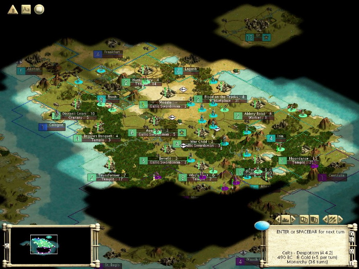 The Celtic people completed their research into Monarchy in 850 BC and embarked on a series of trades. First, we traded Monarchy to Sumeria for Mathematics, Philosophy, Code of Laws, Literature, Map Making, Horseback Riding, and 14 gold; and to the Iroquois for Construction and 301 gold. Next, Construction and Code of Laws went to Germany for Currency and 15 gold, propelling the Germans into the medieval era. I was hoping that I’d get lucky and the Germans would get Feudalism, which my Sumerian and Iroquois neighbors already had, which might have made it practical for me to trade for it. But they got Theology, and buying that from them when they were the only ones who had it would have been prohibitively expensive (if it would even have been possible). I decided to start research on Engineering at Maximum with an eye toward a MedInf/Trebuchet stack as my primary offensive force, since I’d taken too long for Gallic Swordsmen to be quite as effective as I wanted. (Neither pikes nor Enkidus make especially attractive targets for them.)