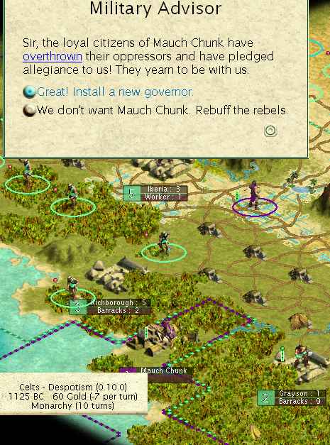 1475BC: Sumerians and Iroquois are now at war. Their movement of troops across our territory, towards each other, remains constant and is very disconcerting and a security concern. Additional defensive units must be built, which plays havoc with Brennus’ REX plans.