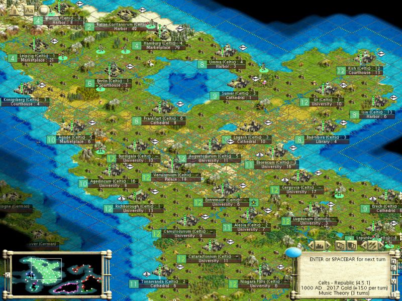 In 970 AD the Celt’s abandoned a constitutional Monarchy and formed a Republic. Research was now completed in 4 – 6 turns, and the coming of universities would maintain and increase that pace. Unfortunately, the French upset Brennus’ wonder plans. Although Entremont completed Sun Tzu’s, the French built Sistine Chapel just a few turns before a Celtic city would have done so. Brennus did complete Leo’s, and would be sure to complete JS Bach’s.