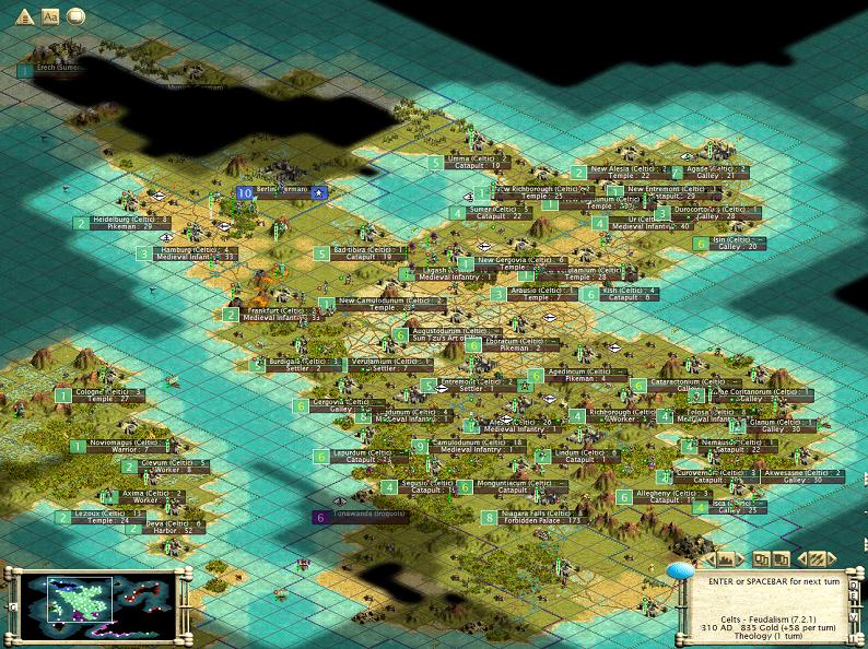 The Celtic forces immediately formed up on the Sumerian border. Brennus declared war in 350 AD. A third MGL appeared in taking Lagash. Ur, Kish, Bad-Tibira, and Isin soon fell to three GS armies and numerous other GS. By 460 AD the war was complete for all intents – the Sumerians held one city far to the north of Germany, a few cities on the western isles – Brennus had been forced to abandon one island city in the face of a Sumerian assault. The Sumerian conquest handed to the Celts the Pyramids, the Temple of Artemis, the Oracle, the Hanging Gardens, and the Knight’s Templar (completed just before Ur was taken). In 560 AD, with little success at leader fishing, Brennus granted peace for whatever Gilgamesh possessed. The Temple of Artemis was producing loads of culture for the Celts, and its effects would assist in controlling the Celtic continent. The Celtic Forbidden Palace had been built by hand in Niagra Falls.