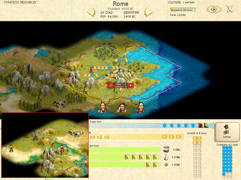 Well this game is going too fast, so I made my first mistake. I thought my worker would be done with the bonus grassland mining in time to help with the Settler, but my calculations were off by one turn. I should have skipped the road on the cattle tile. Now I have to decide whether to delay the growth of Rome or to delay the production of the Settler. The fast Settler is more important so the new city can start pumping units, so I work the forest this turn to complete it.