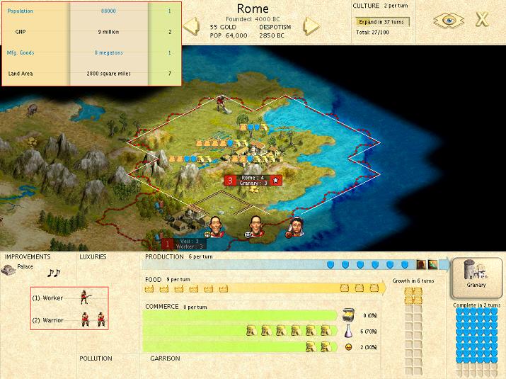 I'm not too worried though, because we are already first in population according to the F11 screen. Even better, with the help of a chopped forest the Granary will be complete before the next population growth and we will grow like weeds.