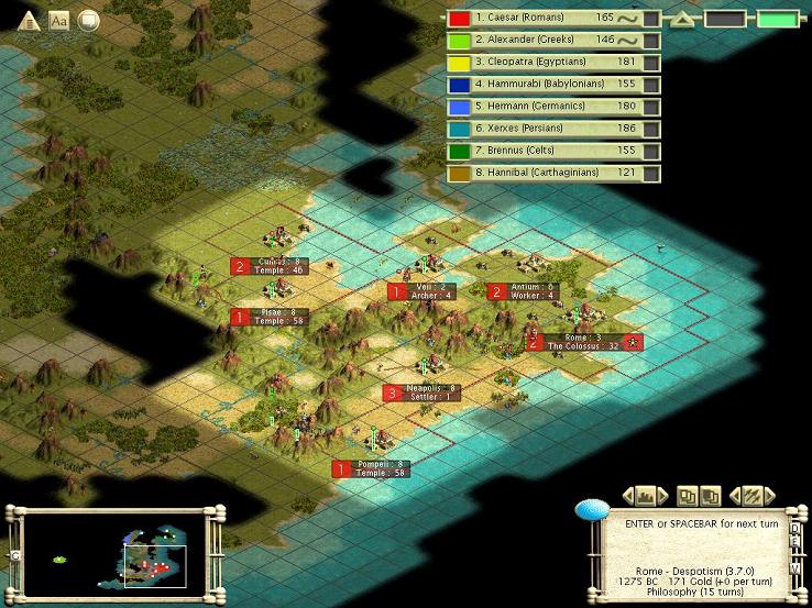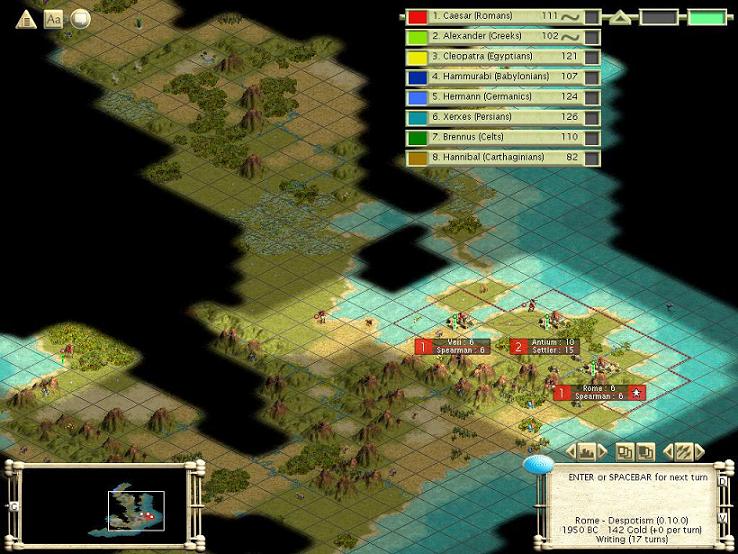 I'm playing the Romans in this game, with kwpulliam playing Homer to my Virgil. I'll post every so often (with several initial posts since i'm starting this thread at 2800 bc) with updates on strategy, discovery, and other assorted stuff.