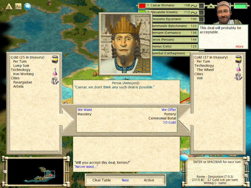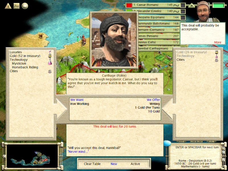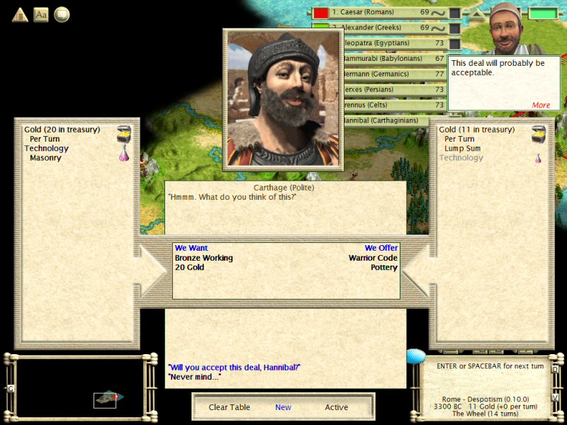 After meeting Hannibal I couldn't get masonry out of him, but did get bronze working and 20 gold for my techs. Not too bad. Hopefully I'll meet another civ and get masonry from them, or wait until I have wheel and do some more trading.