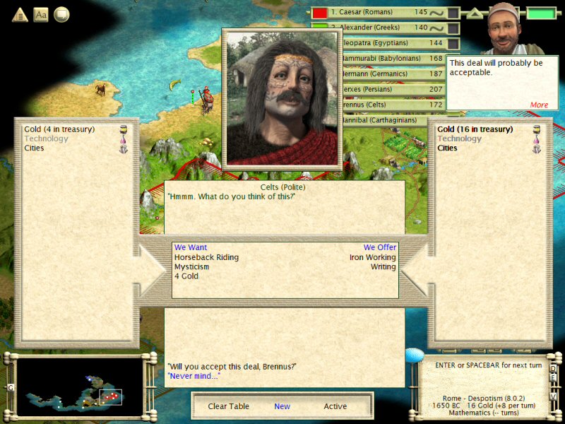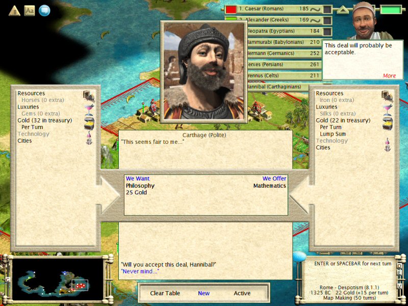 A few turns after contact with Beta of the Greeks, I discover that he is ahead of me in the tech race. He offers me philosophy. Unfortunately I don't have anything to trade him as I'm still working on mathematics...which he ends up already possessing. In the meantime Germany has researched polytheism which they won't give up, and Persia gets philosophy, code of laws, map making and mathematics. I discovered a little later how they did it, since Beta had sent a warrior through their land and the land of Carthage.