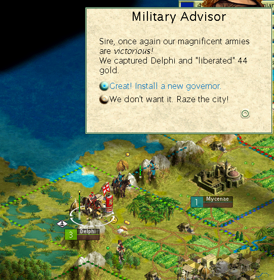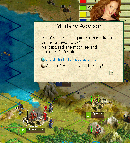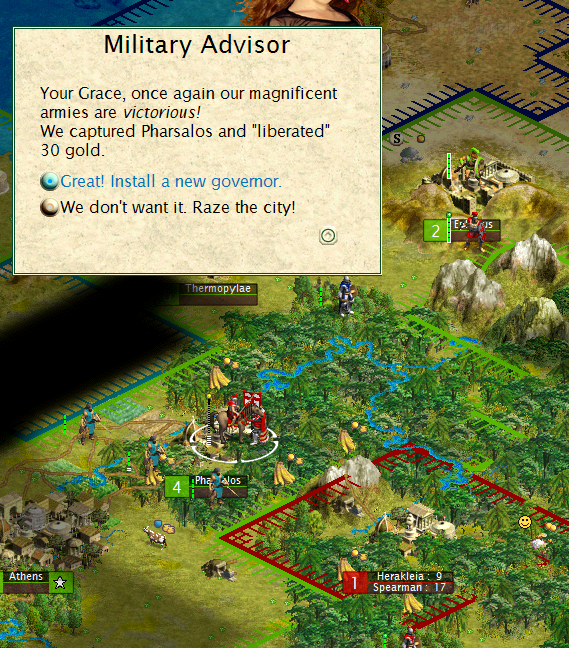 ... with 4HPs left (started with about 16), thermopylae has been captured! btw: this is a great city as it has walls, barracks, iron and access to the sea... so i'll keep it