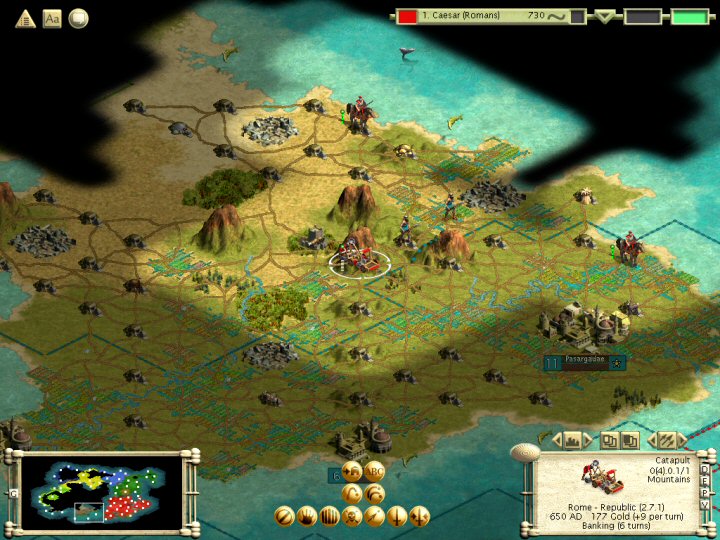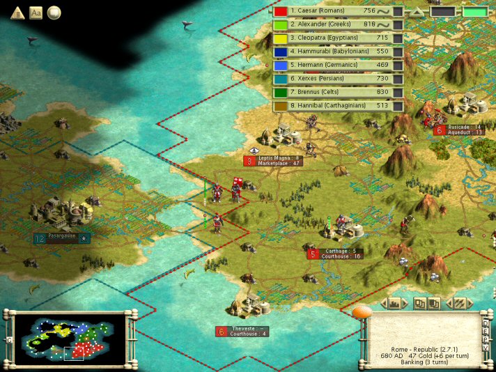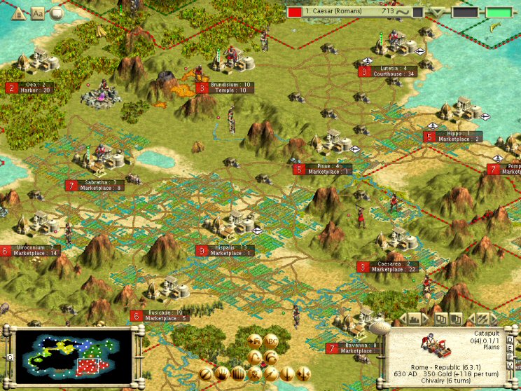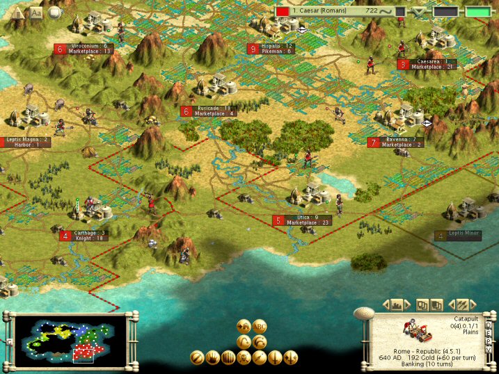 shortly into the war. Things weren't looking too good. Then, my first legion battle was victorious, setting off my GA. After that, the Carthaginians were not the least bit of a challenge. I just achieved a Feudalism, and Rome was pumping out MDI every two turns, with a couple other cities producing every three turns. It also turned out the Carths had neither iron nor horses (now that Hippo had been disconnected from their empire). HAd they not had their NMs, they would have fell ridiculously quickly. I took back Pisae, and produced a GL, who, naturally, formed a MDI army. With that army I was then able to take a city pretty much every two turns (Sabratha [where another GL was formed], Viroconium, Rusicade, Leptis Magna, Carthage, in that order). The second GL built the FP in Rusicade. Erstwhile, every time a few cities happened to produce MDI in convenient chronological order (factoring in relative city distances), I would take another city that hadn't been in my army's path of destruction (Hippo, Brundisium and Ravenna). A third GL was produced taking Ravenna, who created another MDI army. I certainly had not had enough elite victories to warrant a third GL, but I wasn't complaining. Despite my best leader farming techniques, I believe I had only had not ~30 elite victories. A second set of troops mopped up the eastern cities (Leptis Minor and Utica). Sadly, an army was lost when Carthage flipped, this exacting a PRNG retribution of sorts, but all in all I was fairly pleased with events. Theveste was taken shortly after Cartahage was recaptured. I then signed a peace treaty for Oea, Eng. and Theo, plus maybe an insignificant amount of gold, leaving them with but a single city, Hadrumetum (though Leptis Minor has since flipped).