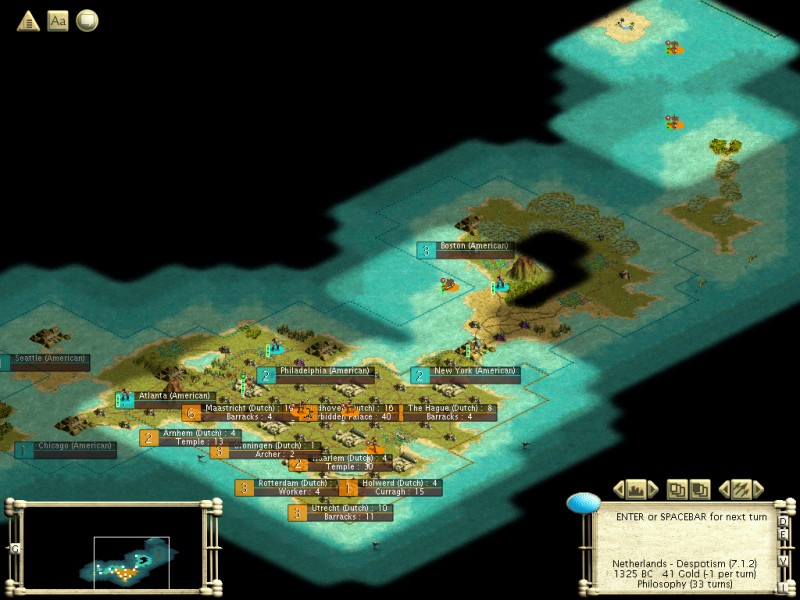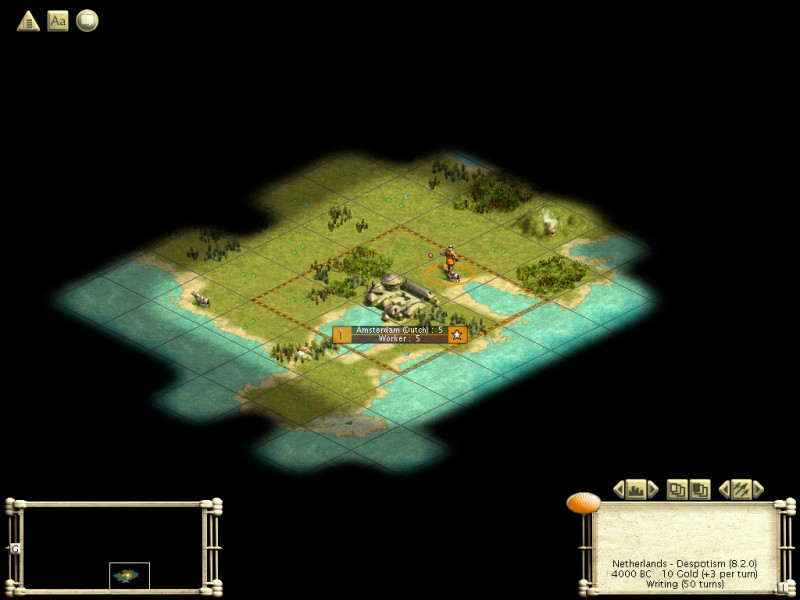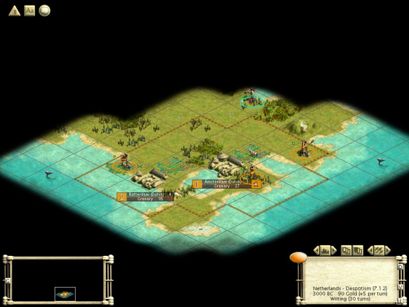 Mon > Emp would be a good comparison as well). Like last time, I am choosing my civ, the Dutch (last time was Egypt, an irony which will be ecplained shortly). Last time I took a Small Archipelago as I want a fairly quick game and not too many opponents, without the constraints and distortions of a Tiny map. I also made it 80% water, Normal, Temperate and 5 billion, in the interest of getting a fairly good map. I also restarted ~5 times in order to get a good start, whereas last time I went all random in these categories and played the first map I got. Essentialloy, I don't play SP Civ like I used to, and I want a fairly winnable game that I can do quickly. I also want to document as I go, rather than doing this until I win and then coming back with my notes. Barbs are Random, BTW.