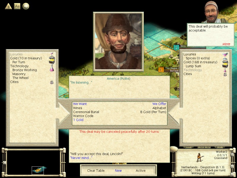 I also chose my opponents, China, America, Japan, Egypt (!) and Arabia. This shows the dramatic changes to both Rel and Ind since Vanilla, as I previous took Egypt as my builder civ and now want them as my builder opponent. Here's my rationale: I don't want Agr (obviously), Com, Sea or Sci in my opponents (and there are few enough that this isn't too limiting. Com/Sea both star with Alph, which is no good, as well being generally good traits (I didn't choose the Dutch for nothing!) Sea is used poorly by the AI, but the more I can keep contacts down, the slower the tech pace, which is why I want no Sci civs either. Mil and Rel are on the verge of useless for a Deity AI, and Ind is not as great as it used to be. Exp. is good because it's a small map, of course, though its one caveat is they start with Pottery, which is the only tech I want to trade for the first 50 turns (well, 40 anyway).
