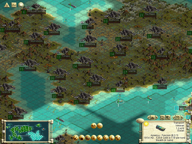 This was ready and in position in 1914AD, and I launched the attack the next turn. The Aluminum Landing is at Munich11 in the pic below.