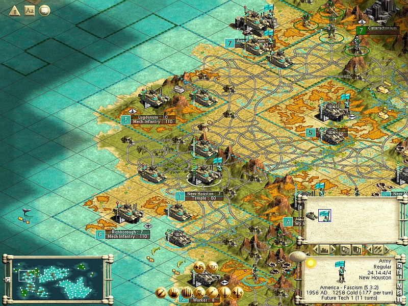 I didn;t really get started on a military build-up until about 1770AD. That century, I had completed all of my SWs (including Iron Works), as well as Cure for Cancer, Internet, and SETI. So, in addition to Hydro Plants and Research Labs, by that time major cities had completed everything up through Hospitals (if they made sense... mostly coastal), Offshore Platforms, and Mass Transit; minor towns/cities had completed at least a Temple, Library, and Harbor, and many were working on Courts. So, a fairly good build out... and the Celts and I stayed pretty neck-and-neck in research, so I can't really *complain* about Fascism, but... (more in the After Game comments).