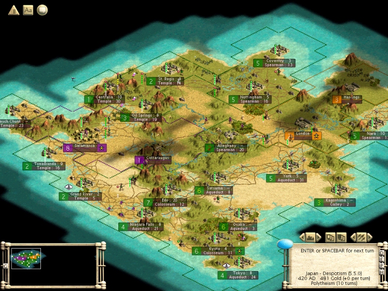 The other problem is the high corruption in most cities of my large, despotic empire with a capital on the southern tip. With me edging towards feudalism, it'll be wait-for-the-Iroq's-to-get-republic. Or better - build an FP. Time to plan another war with the English.