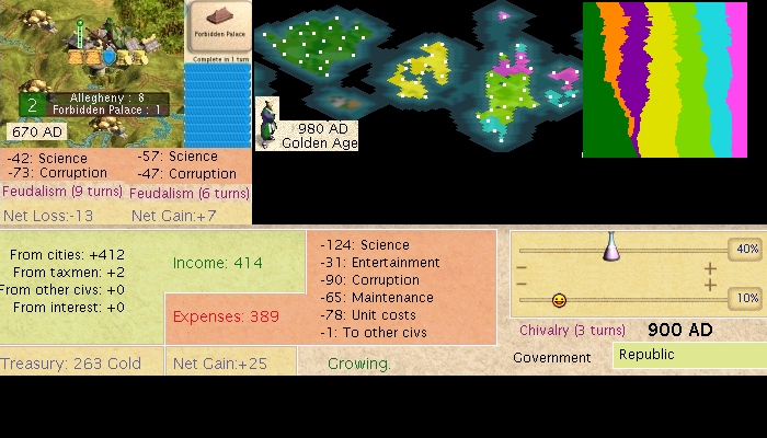670AD - French build Great Library. So much for London's raison d'etre - taken. Also, Egypt builds Hanging Gardens. At least it wasn't the Sistine, so maybe they're not that far ahead. FP build with GL in Allegheny. The graphic below (upper left) shows the imediate effect of this - of course the fuller benefits are felt over time.
