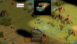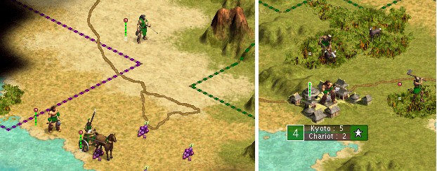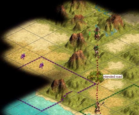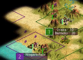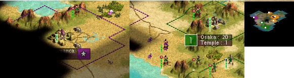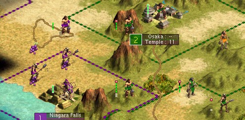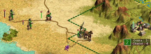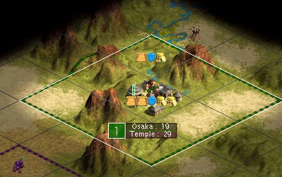 . The victorious archer is fortified for healing. The lone enemy warrior has moved to the border of Osaka. A regular warrior is pulled out of Osaka and placed on the mountain in-between the Iroquois warrior and Osaka.