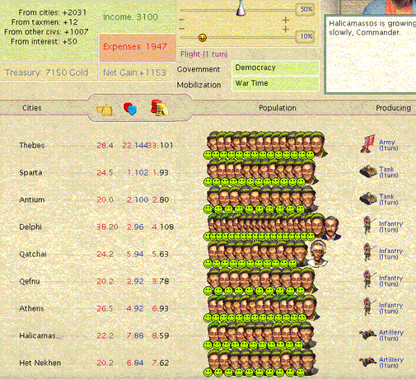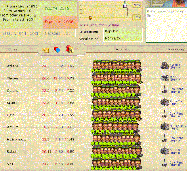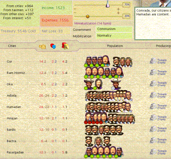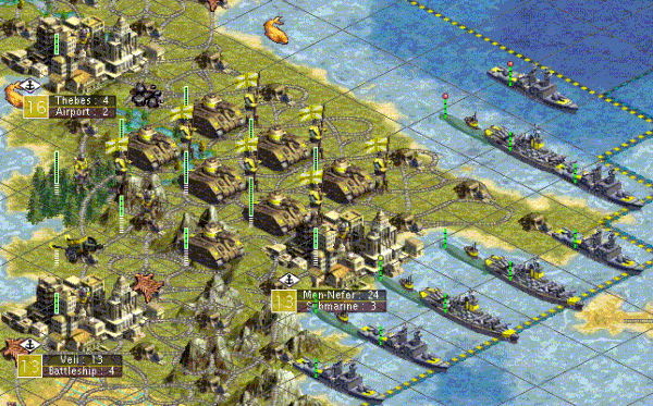 The reason I'm so self-satisfied is that I've got the invasion of Persia queued up for the next turn, with 4 major landing zones (including rubber and aluminum denial), and huge amounts of bombardment support (JFs, Bombers, and CMs, not to mention the naval fleet) on two... suffice it to say that, among my total military force (353 units, including only 2 Workers), the attack includes 85 MA... and Xerxes has a grand total of 6 Tanks.