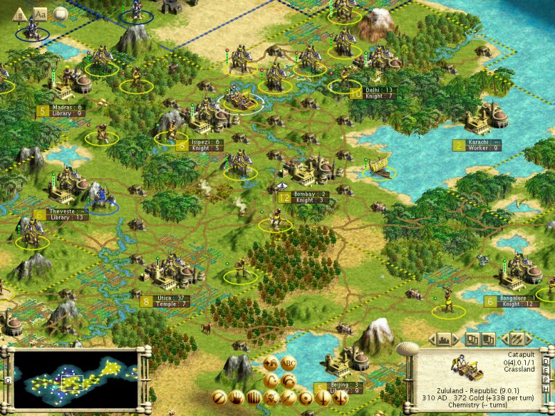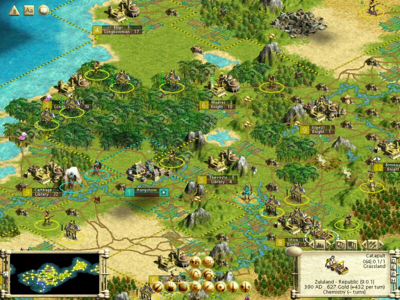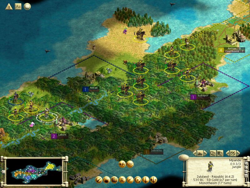 Immeadiately, I signed an alliance with the Babylonians. In the 2nd combat, I got a leader. Traded Republic and 35gpt(to cathage) for Monarchy, Feudalism and Engineering. I started researching invention in the hope of building Leo's and having a large(40 or 50 odd) horseman upgrade which could be game-winning. But I still need to road the jungle: