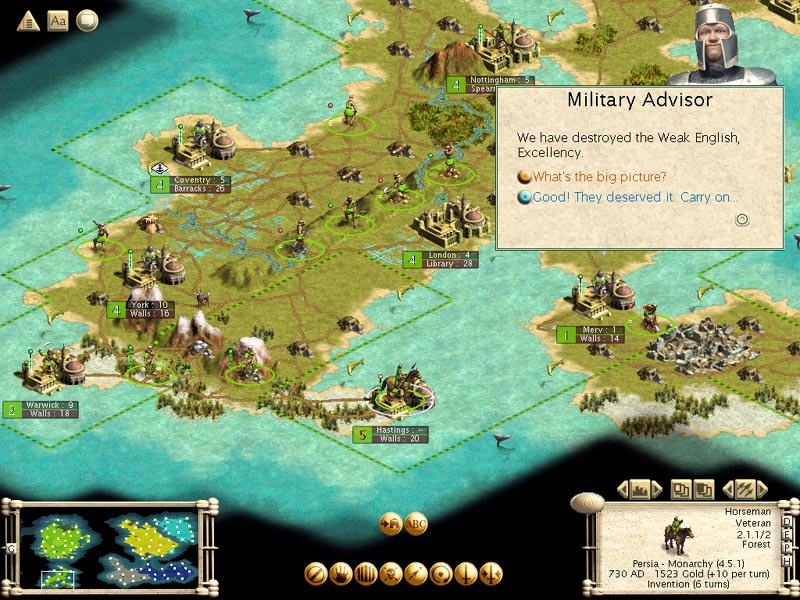 I did manage to squeeze in a few turns last night - wiped out the English, actually. My riders had a hard time on the first town they came across in England, but once that fell, flipped, fell, flipped and finally fell (I wanted to keep it as a toe-hold on this new continent since I hadn't looked at the map so didn't know how big it was) I was all set to take the rest of England. (next time I'm bringing my own settler but... can't build riders and settlers...)