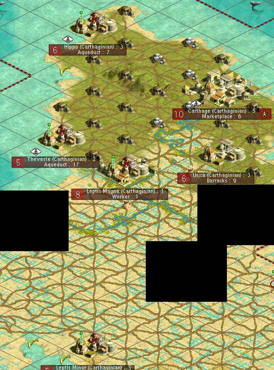I still only had six cities, but I was poised for very rapid growth. The jungles were mostly if not completely cleared, and I had swarms of workers descending to do their best to make the desert and southern plains bloom. Fortunately, barbs hadn't caused me any serious headaches.