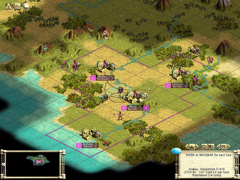 2190 BC, temple complete in Damascus, barracks started at 4 spt with chop in 4 turns. Re-growing Mecca up from 2 pop with a Barracks... then alternate Settlers, Workers and military units.