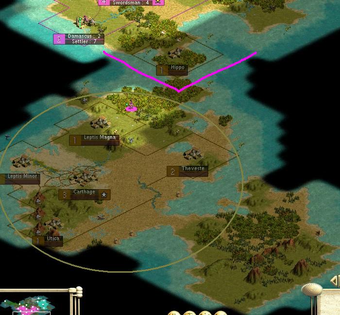Carthage managed to plop a settler on the spices to the south but I have resolved to take that territory by force. I will build a new city 1 tile to the S as indicated.