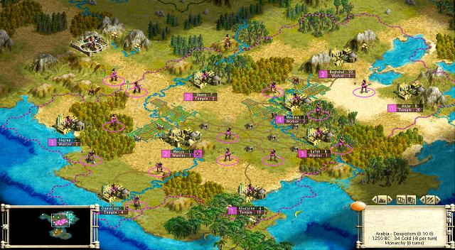 In the initial turn, traded for Writing and started on Polytheism to get Monarchy as fast as possible. Also disbanded a Warrior in Mecca, so that the Settler can be completed one turn earlier, with no shields lost.
