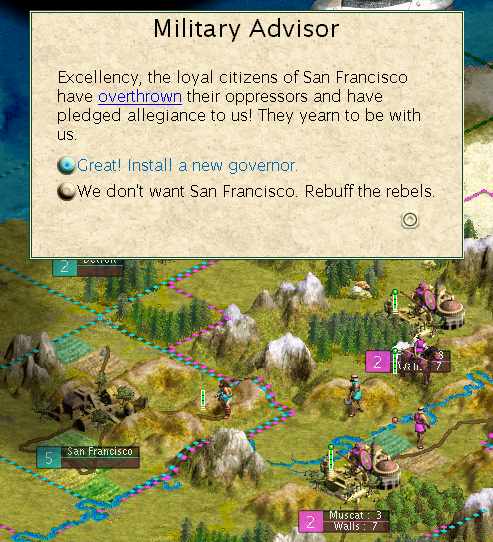 Block 3 saw the completion of expansion and the commencement of building - marketplaces, courthouses in addition to finishing off the temples and a couple of granaries. 1 Mkt completed so far. Tempted to spend pile of cash on buildings, but holding back for now. Military levelled off. Tech reached the middle ages, and contact was made with the Civs on the Western continent via Japan's Lighthouse. San Francisco, near Japan and the northern spice cluster flipped to me.