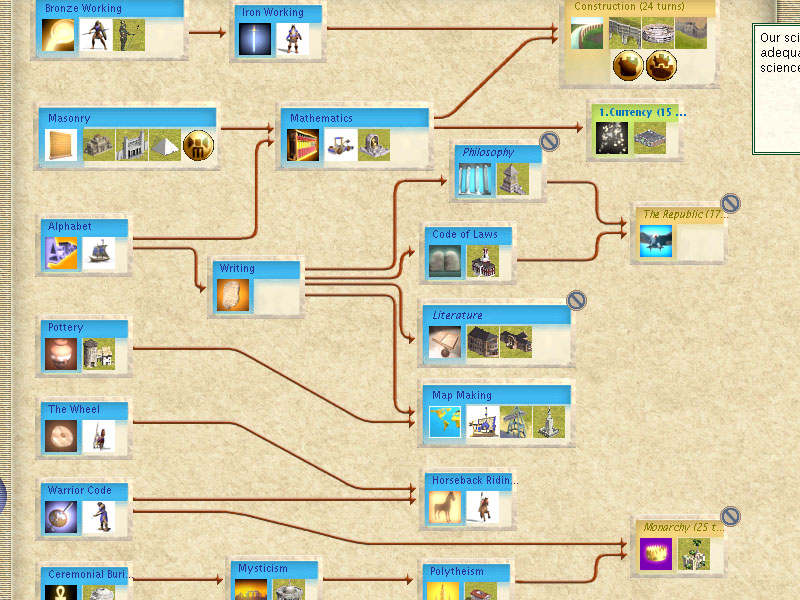 1250BC: Philosophy is complete. I swallow my pride and take Map Making as my free tech. Start researching Code of Laws. Cleo still won't give me Polytheism, so I first trade alphabet (I think) and writing (successively) for a bunch of gold, the trade Philosophy to her for Polytheism. Next, I traded Phil and Poly to Sumeria for Mathematics, Literature and 59g. Next, I trade Lit to Japan for Horseback Riding & 22g. The Hittites still suck. Start building a couple of harbors, so I can upgrade curraghs.
