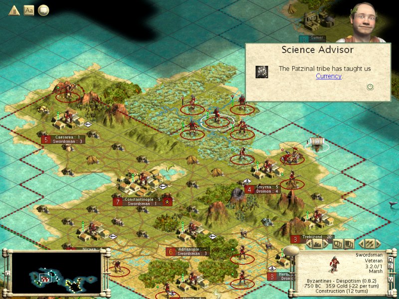 So I have the Great Lighthouse and Dromons are 2 a penny. So there didn't seem to be anything better to do than explore, sending ships generally northward in the hope of discovering new lands. As others have commented, the AU Mod seems to have succeeded in widening the variety of AU research. The Dutch managed to get the Republic before ceremonial burial. Similarly the Egyptians and Russians had Monarchy before the wheel or Iron Working. This meant I was quickly able to trade for all the remaining ancient era techs.