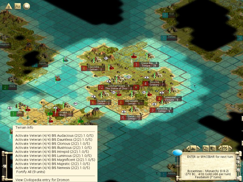 First Imperial Navy moves around the island to the West. Catapults north of Kyoto bombard a small stack of Japanese forces that moved behind me. BIS Sovereign loads a Settler and a Swordsman and embarks for the near Western island. Secondary swordsman force moves West to within 1 tile of Edo. Warrior on ivory tile killed by the Elite Imperial Guard (GL-proucing unit