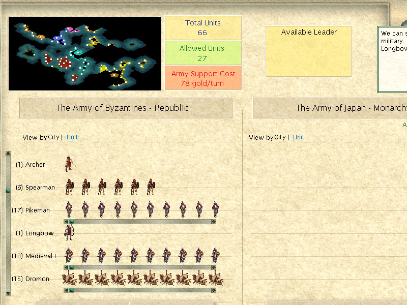 1 settler, 7 worker, 4 spearman, 1 pikeman, 8 Med infantry, 4 dromon