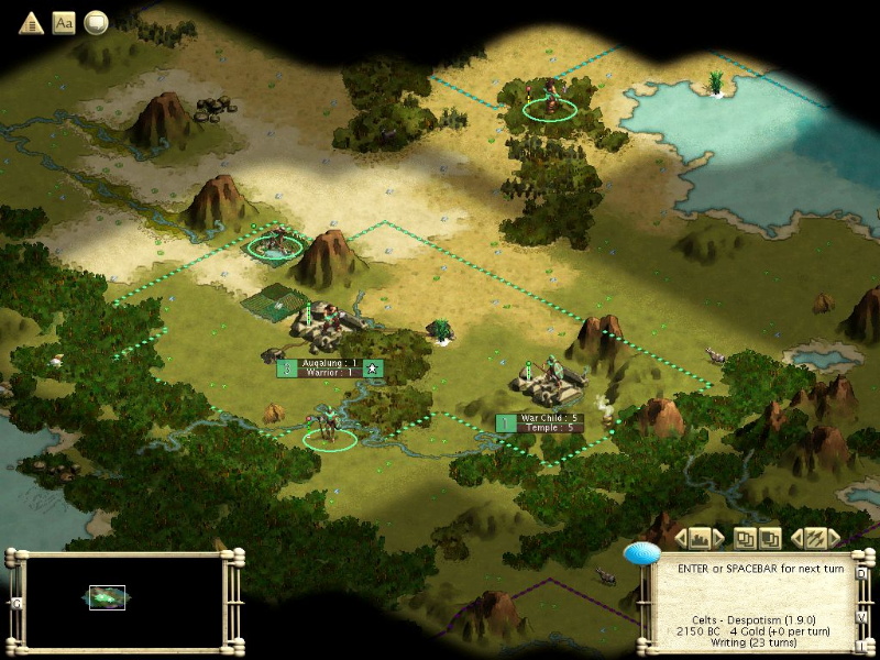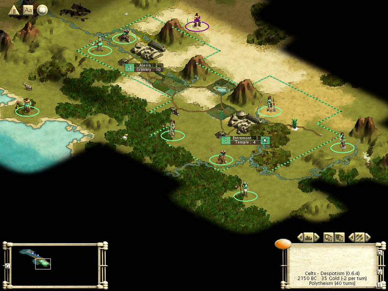 Being tired of harsh life of nomad, the Celtic people gather around their trusted leader, Brennus, eager to settle down and build their glorious civilization. Brennus believe they'd better leave their forest intact, thus leads his people to northwest plain and build the first city, naming it Entremont. Worker of Celts begins mining and roading southwest grassland, then irrigates and roads to north oasis.