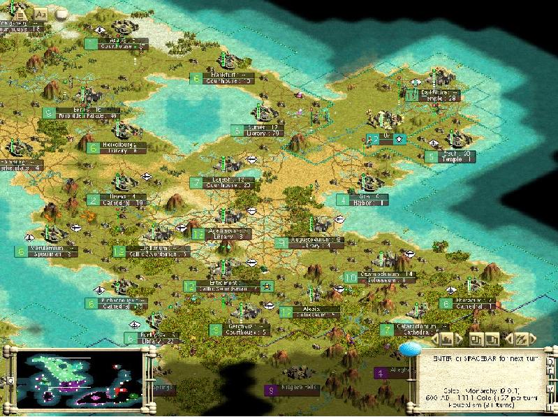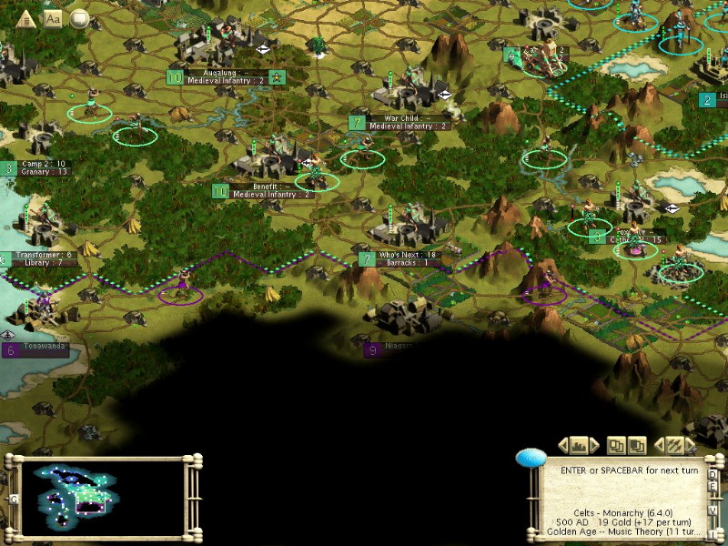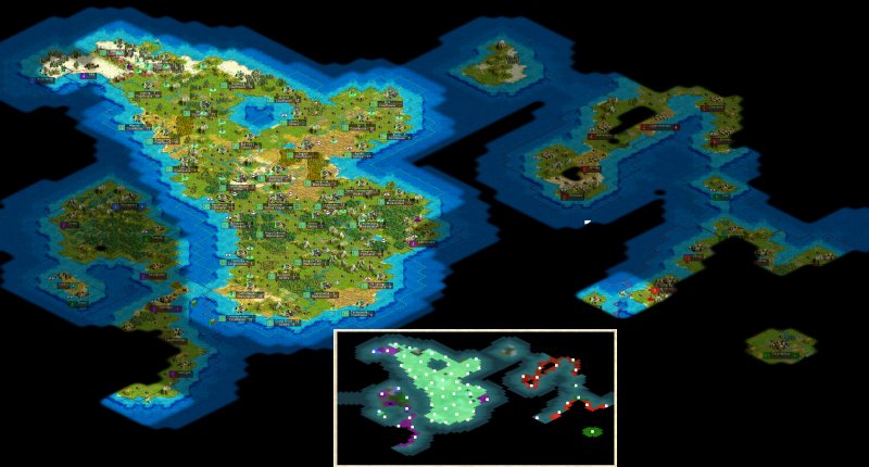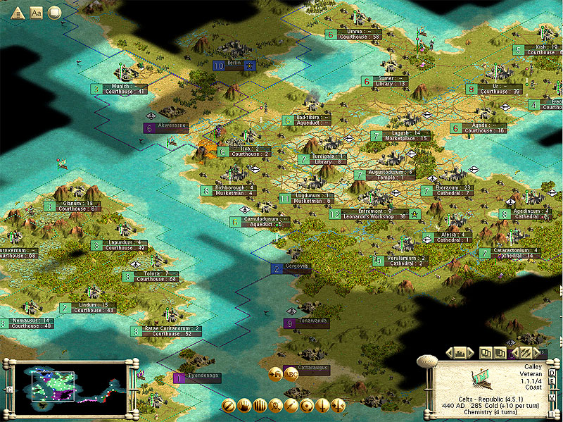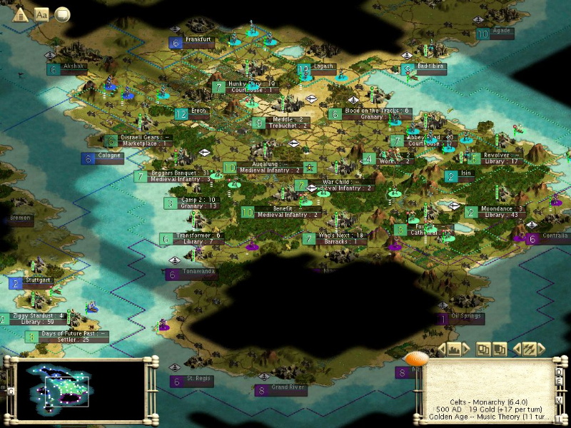 We continue the narrative, having just completed our first GS signaling the beginning of the first serious Celtic military build-up. This by chance coincided with the completion of the REXing phase, as the map was essentially filled in and the borders well defined, with the Iroquois to the south, Germany to the NW and Sumeria to the NE.