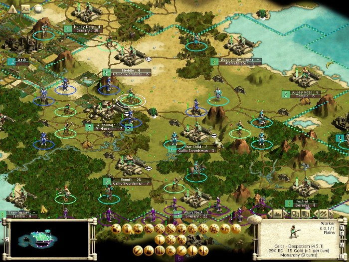 At this point I again notice how extremely stupid I am, after wondering how come my cities can build temples super quick I notice that the celts are religious. I had it in my mind for some reason that they were Agr, Mil not Agr, Rel. I have been putting off changing out of despotism for god knows how long so I wouldn't lose 8 turns of wartime production when in fact I could have made the change in 2