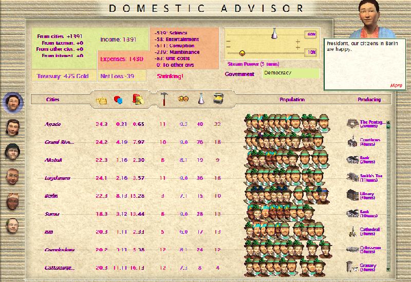 110ad - Trading possibilities abound. I give 40gpt and 350 gold to the Aztecs for chivalry. I then trade chivalry and 35gpt to Sumeria for theology. I trade theology and chivalry to Germany for invention and 50 gold. Theology goes to the Aztecs for philosophy (a throw-in), 24gpt and 350 gold. And finally I trade theology and chivalry to the Iroquois for the Republic (essentially another throw-in since I intend to be at war a lot in this game) 20gpt and 40 gold. Just like that I received 5 techs and tech parity for what amounts to 27gpt and 10 gold. I love tech trading!