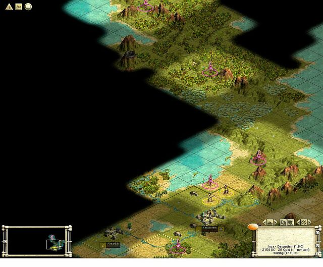 The strategy for game 3 was to hit the AI with an earlier (and smaller) pillaging campaign. 4 Chasqui and a Settler were built, with current builds at 2150bc including barracks for a unit pump (for anticipated defense) and another settler to make the lake hill irrigation pass through city. But enough of that lets move on to the pillaging details.
