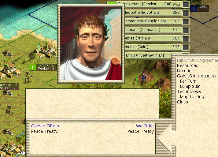 The Babs had 7 bowmen. There are two romans and two or three Germans, along with 2 egyptians, all within striking distance. If the Persians showed up as well, we would be at risk for survival. Then you have to expect the Romans to bring some legionaries, with arrival expected in 10 turns unless the alliance with Persia has presented travel problems for the Romans.
