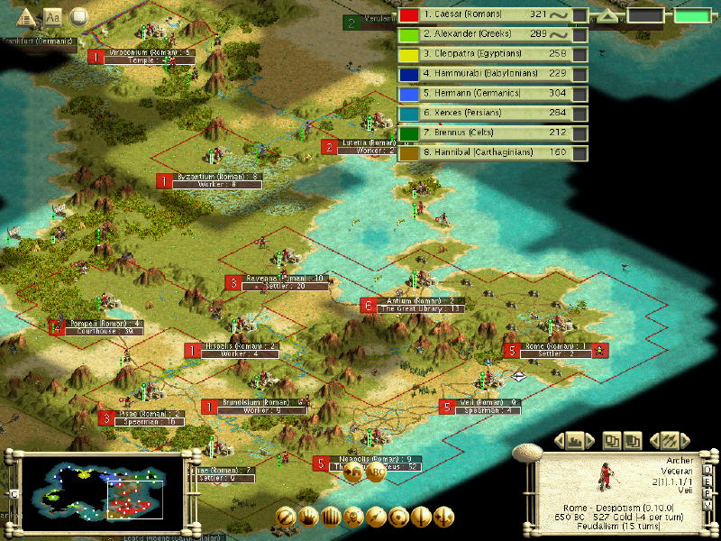 By 3000, I found Carthage borders. Well now I know which direction to expand. Set both worker to building a road from rome to the west. Hopefully I can meet somebody else and learn pottery and build a granary in Rome.
