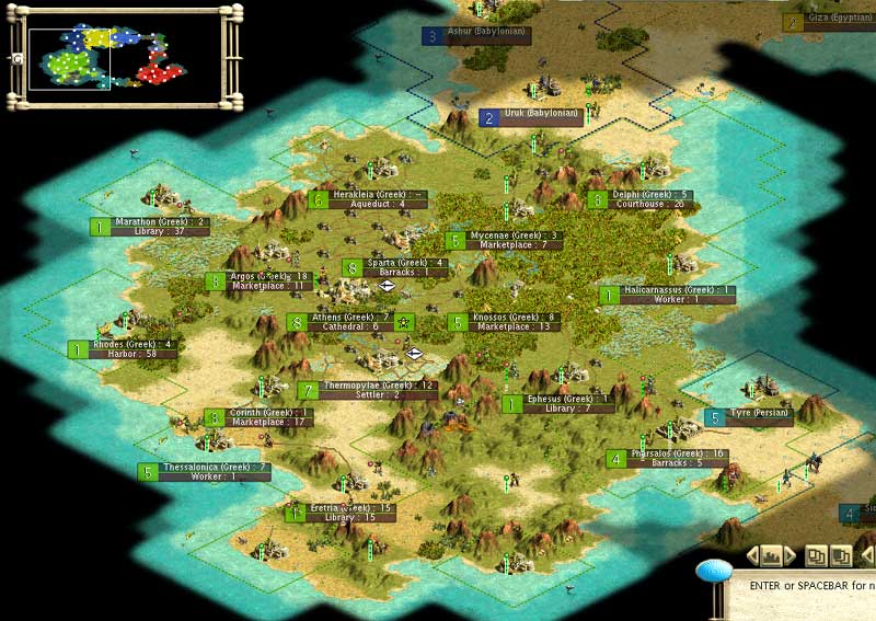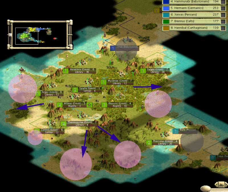 Eventually 1 explorer broke out of my geographical restricted land, and headed north to meet the Babylonians and Egyptians. I profited some by selling them technologies I had found.
