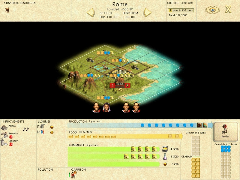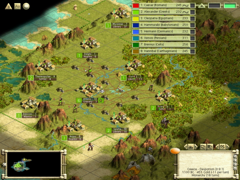 Nathan will see the effects of the GA in the F11 stats, where I have skyrocketed. Although I would have preferred it in Monarchy, this is a not-so-bad despotic GA, as I am up to 10 towns. It bums me out a little that I still really want to finish a bit of my strategic REX to get resources... each Settler built means less tiles worked, and thus foregone shields. C'est la vie.