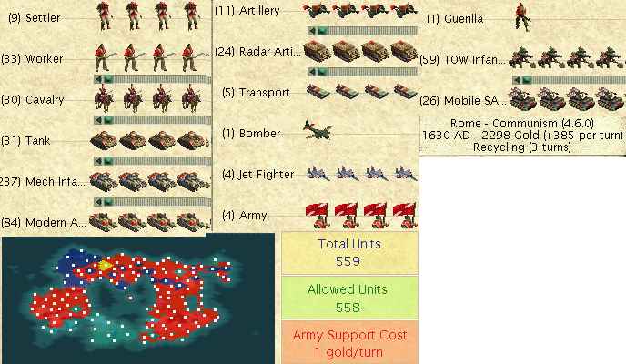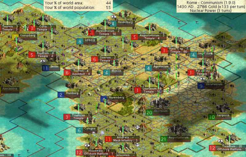 The glorious Roman Empire has conquered the Greeks, who were led by their great leader Theseus. This story follows the Empire's development in the modern era, picking up after the discovery of Rocketry as their second modern technology. The game is being played on Emperor level under the AU Mod rules.