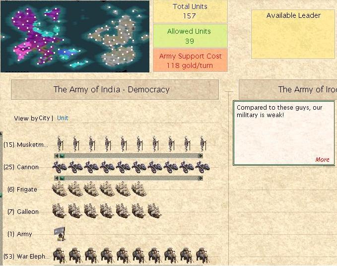 I hit F3 just to check out my army and I noticed two things. The Iroquois are in anarchy, finally switching out of Feudalism (the other AIs have used Republic). Check out what my advisor is telling me though. And then have a look at my armed forces.